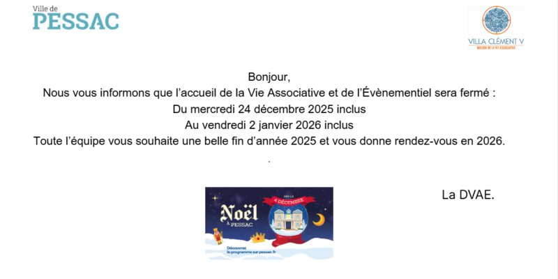 Fermeture de l'accueil de la Vie Associative et de l’Évènementiel : Du mercredi 24 décembre 2025 inclus au vendredi 2 janvier 2026 inclus