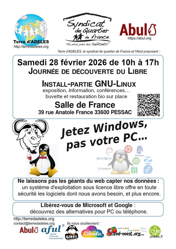 Venez découvrir le logiciel libre. Présenté par Terre d'Adèles, Abul et le Syndicat de Quartier de France.