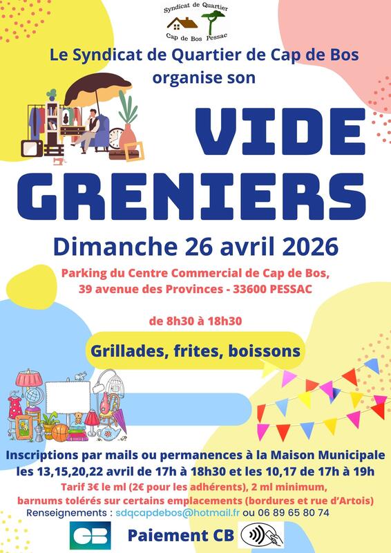 Vide-greniers d eprintemps organisé par le SdQ Cap de Bos. Grillades, frites, boissons et bonne ambiance.