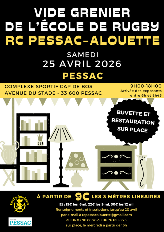 Le samedi 25 avril 2026, sur le complexe sportif Cap-de-Bos – avenue du stade 33 600 Pessac, se tiendra le traditionnel vide-greniers de l’école de rugby du RC Pessac-Alouette.